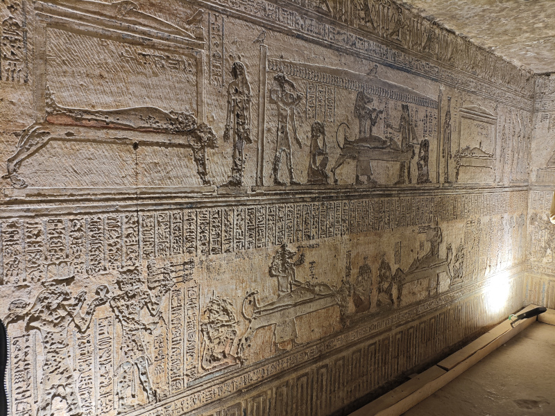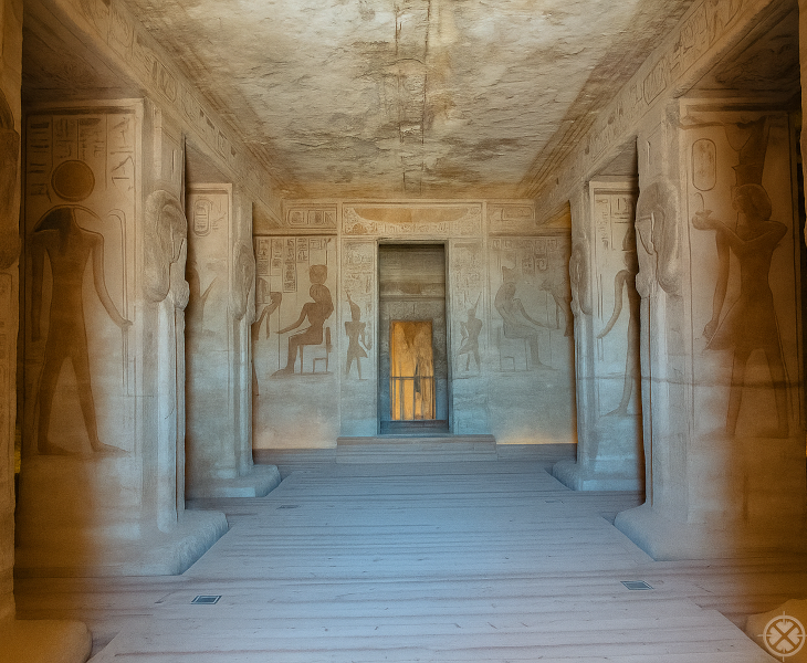 Astronomische Ausrichtung: Ein besonderes Phänomen zeigt sich zweimal im Jahr, am 22. Februar und am 22. Oktober: An diesen Tagen fällt die aufgehende Sonne genau in die Tempelachse und erhellt die Statuen im Allerheiligsten – mit Ausnahme des Gottes Ptah, der mit der Unterwelt verbunden war und bewusst im Dunkeln bleibt.